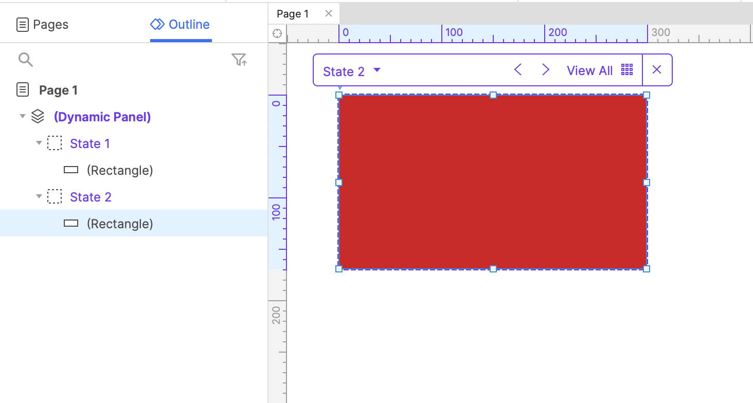 - Drag a rectangle widget into State 2 of the dynamic panel, and set its fill color to red.