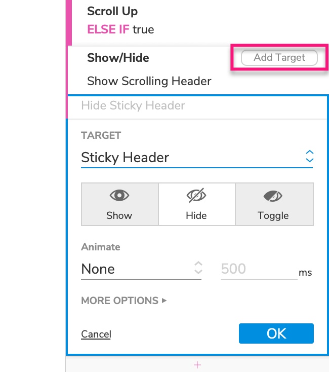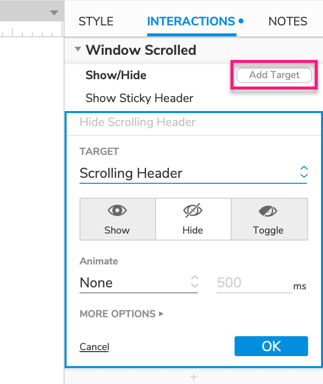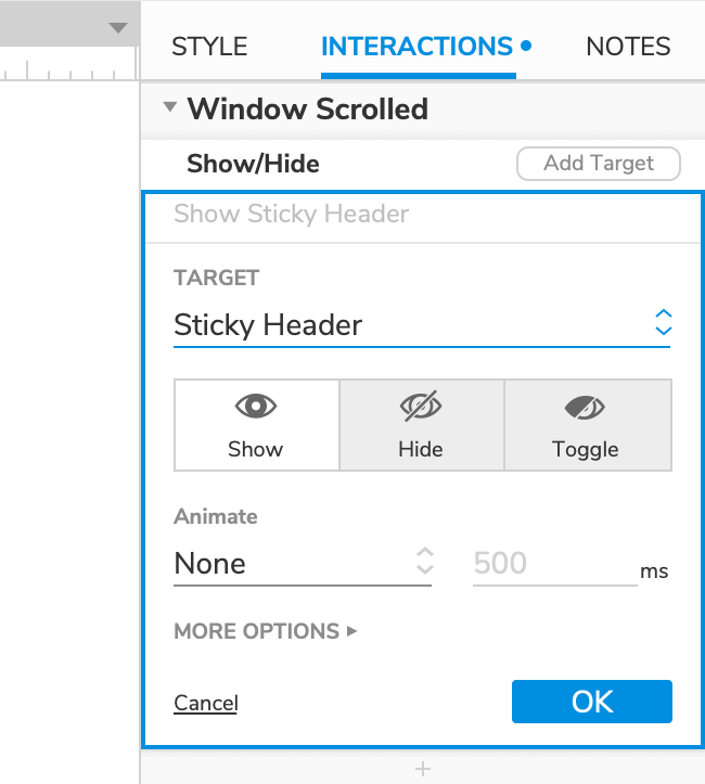 Select the Sticky Header dynamic panel in the Target dropdown.