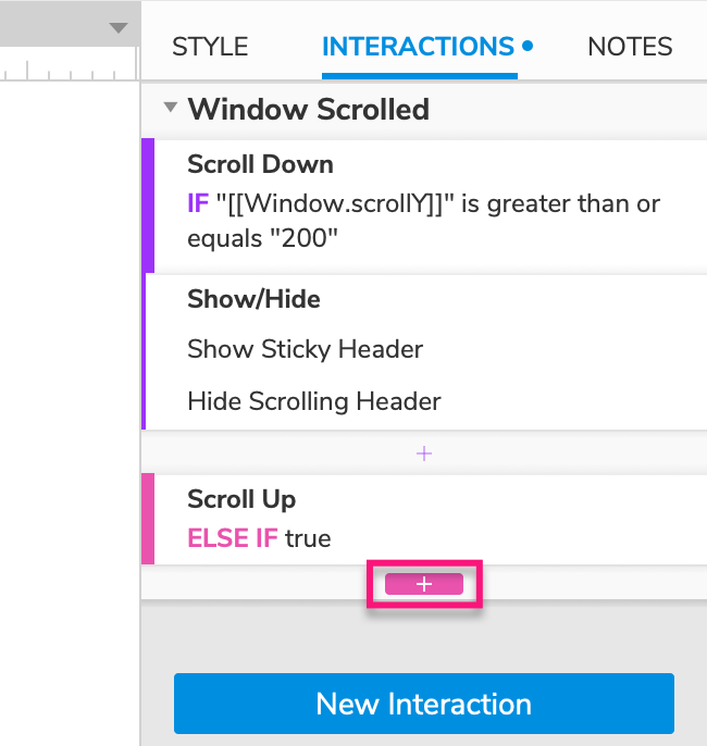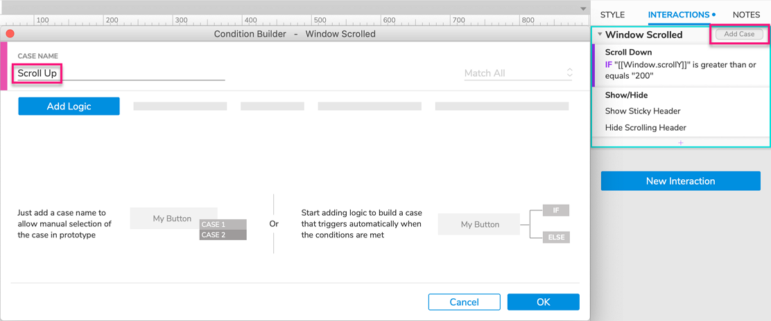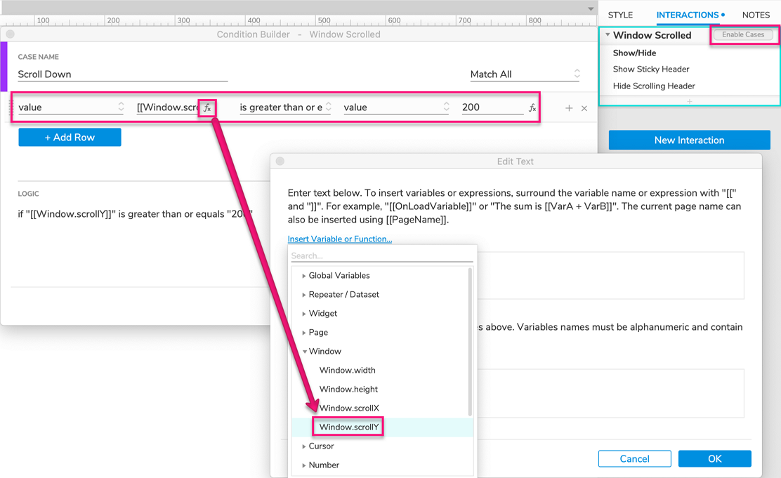 Hover over the Window Scrolled heading in the Interactions pane and click Enable Cases to the right. In the Condition Builder dialog that appears, name the case