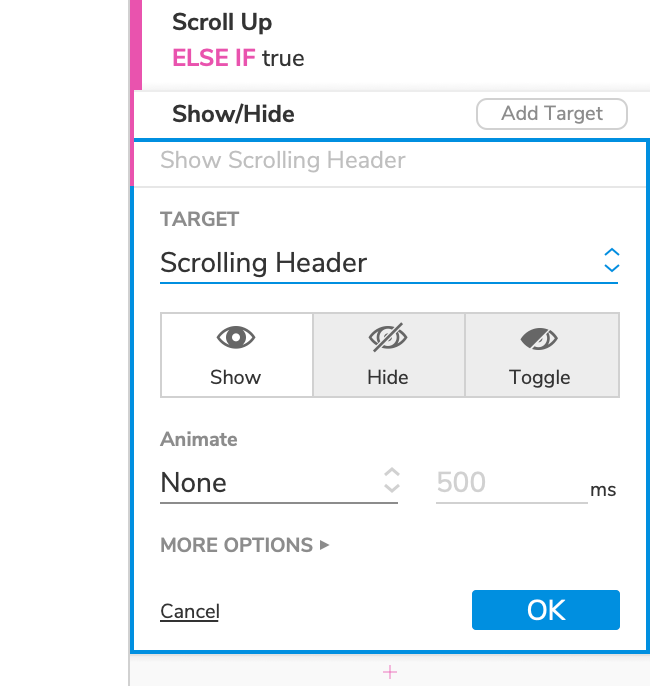 Hover over the Show/Hide action and click the Add Target button that appears.