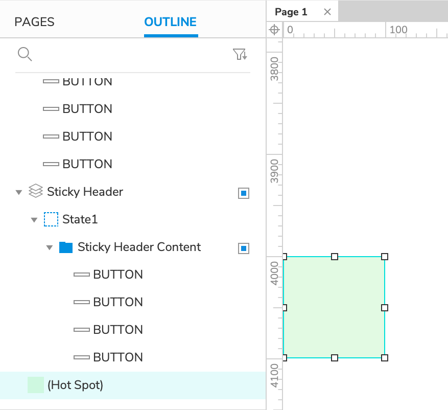 - Drag a hot spot widget onto the canvas and place it at (0,4000). This will make the page scrollable in the web browser, but the hot spot widget will not be visible.