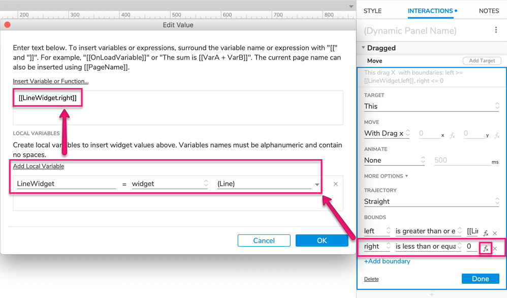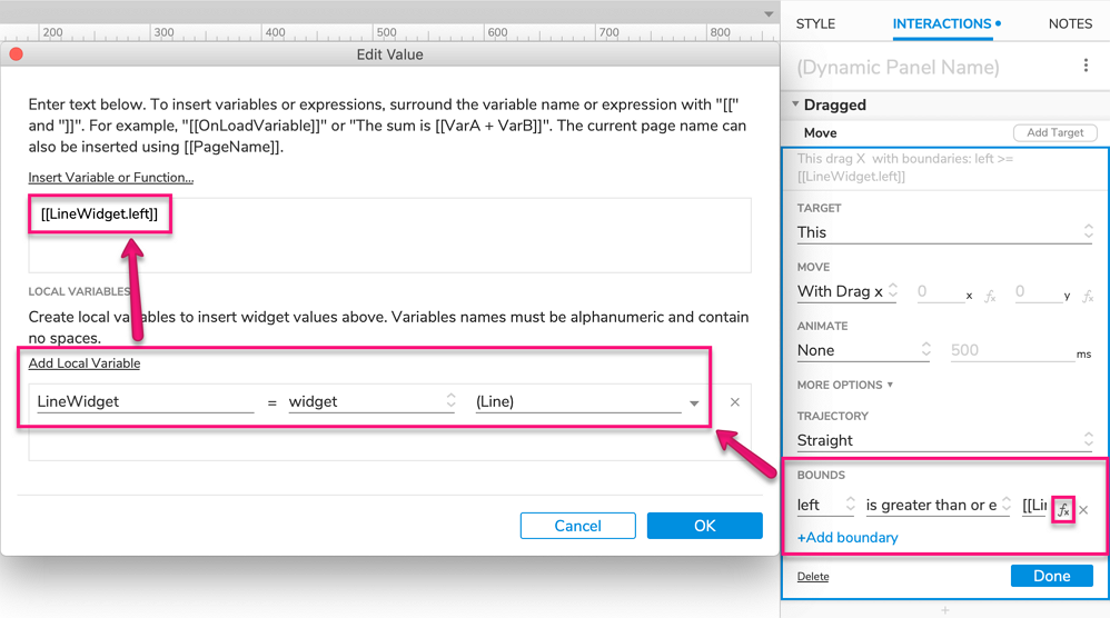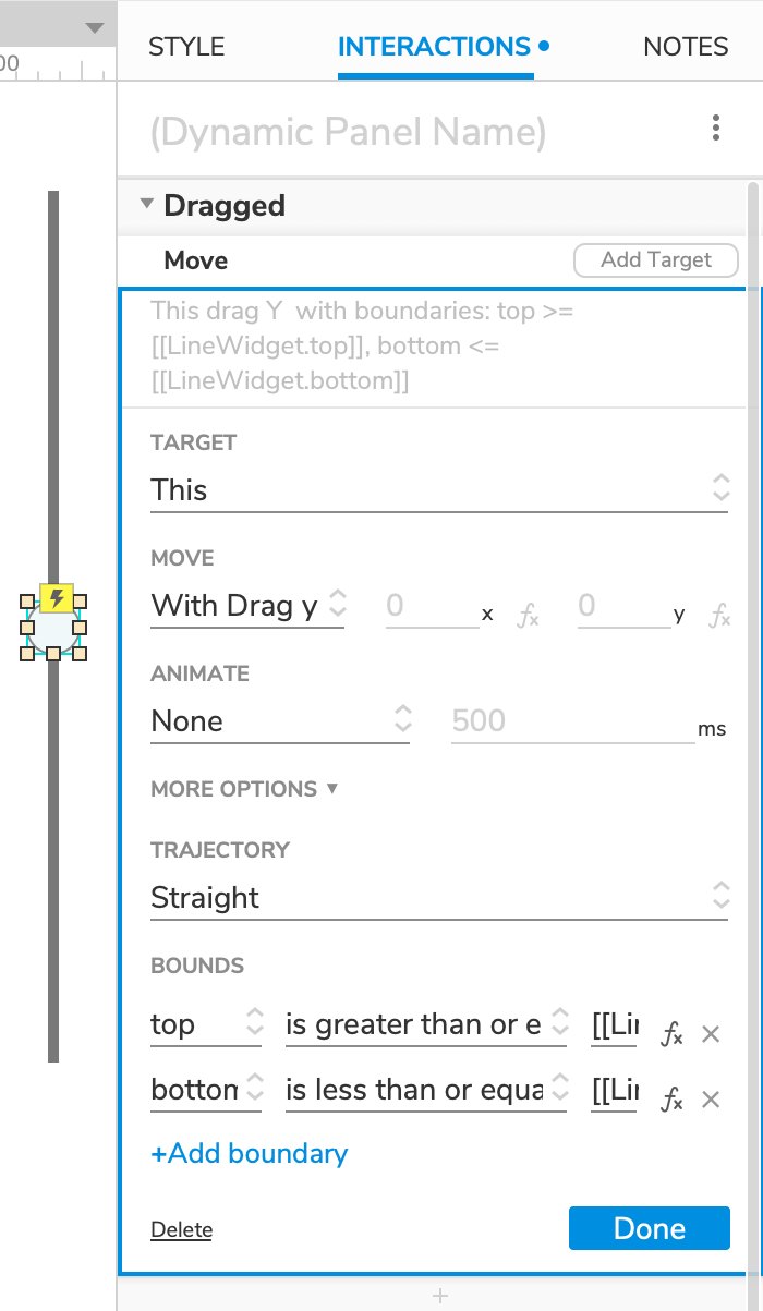 The boundary we've just created, left — is greater than or equals — [[LineWidget.left]], means that the dynamic panel's left edge can only move to X values that are greater than or equal to the X value of the line widget's left edge. In other words, it cannot move any farther left on the page than the line widget's left edge.
