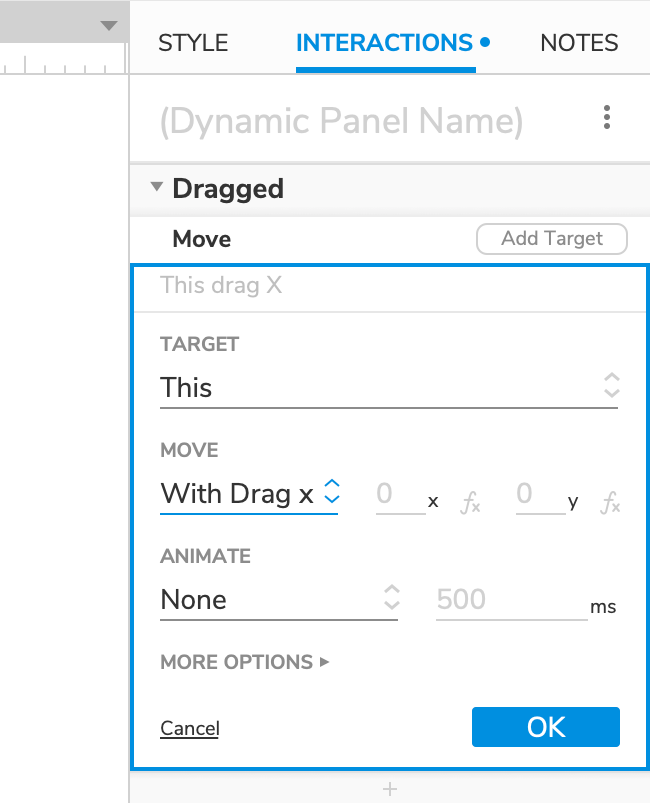 In the Move dropdown, select With Drag x. This will make the dynamic panel follow the cursor along the X (horizontal) axis as you drag it in the web browser.