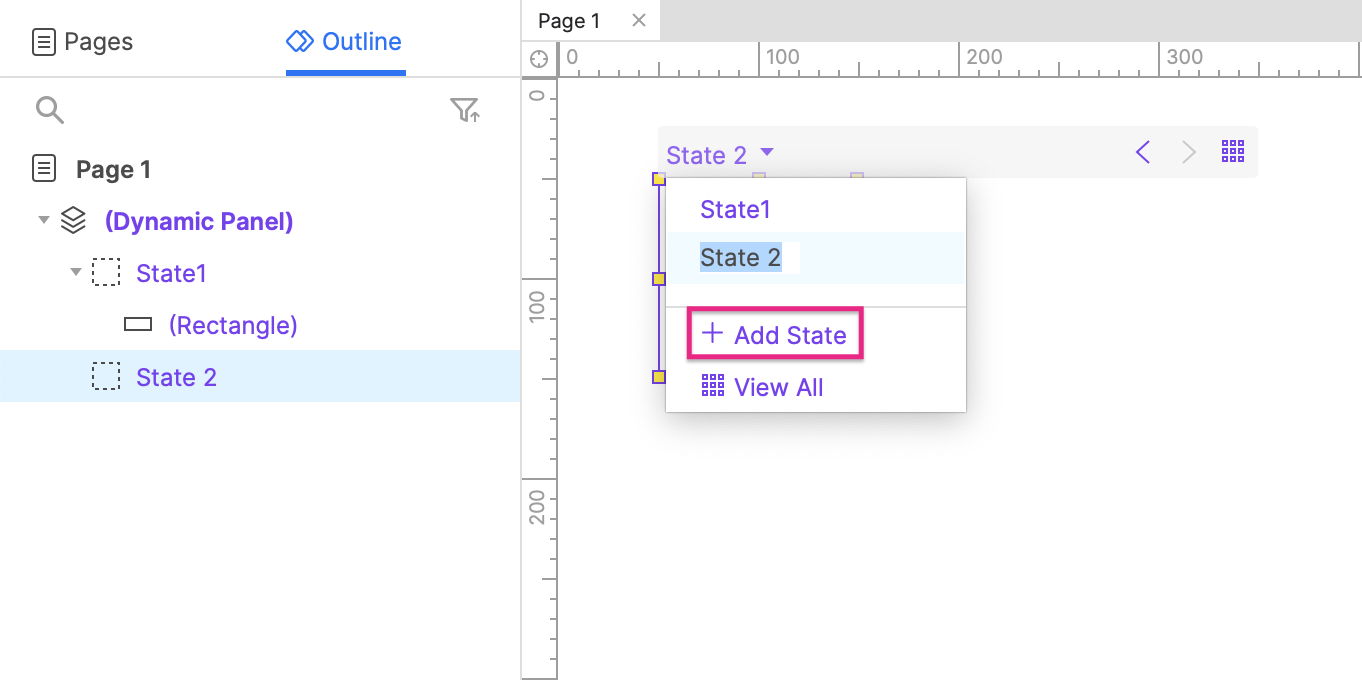 At the top of the canvas, click State 1. At the bottom of the dropdown that appears, click Add state and press ENTER to create State 2.