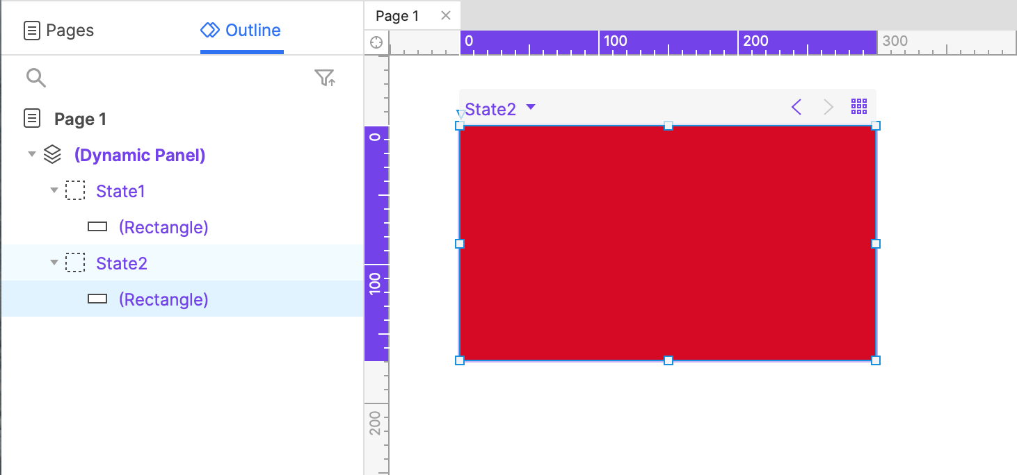 - Drag a rectangle widget onto the State 2 canvas, drop it at (0,0), and set its fill color to red.