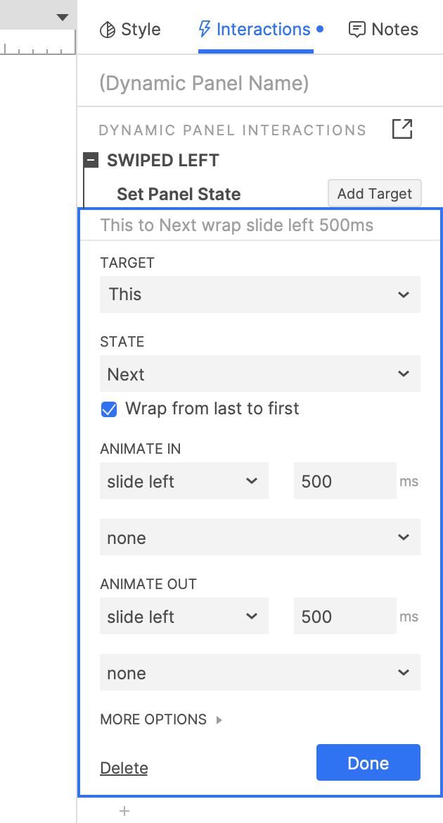 Repeat Step 2 with the Swiped right event. Set the dynamic panel's state to Previous instead of Next, and choose Slide right for the Animate in animation.
