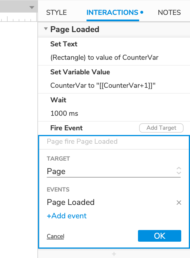 Click the Insert action icon at the bottom of the Page loaded block a final time, and select the Fire event action in the list that appears.